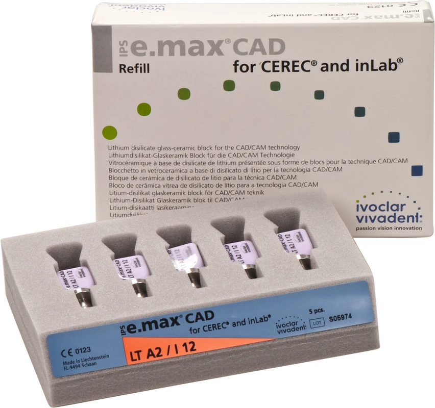 Die IPS e.max CAD for CEREC/inLab ist eine hochfeste Lithiumdisilikat-Vollkeramik, mit idealen ästhetischen Eigenschaften. Die Keramikblocks sind optimal für die Herstellung von vollanatomischen Kronen, Inlays und Veneers geeignet und werden im inLab-System oder CEREC-System (Sirona) verarbeitet. Die Blocks sind in unkristallisiertem Zustand bläulich und leicht bearbeitbar. Nach dem Kristallisationsbrand ist die Keramik zahnfarben und hochfest. IPS e.max Kronen aus CAD LT können selbstadhäsiv oder konventionell befestigt werden.