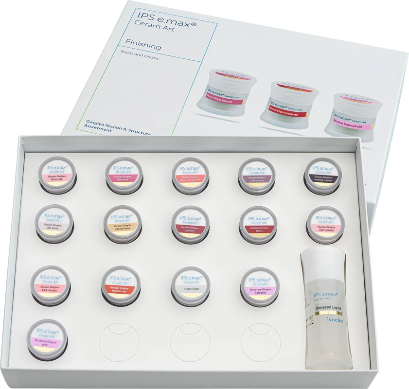 Mit IPS e.max® Ceram Art von Ivoclar beginnt eine neue Ära der dentalen Gestaltung: Die innovative Produktlinie aus universellen Mal-, Glasur- und Strukturpasten verwandelt keramische Restaurationen in einzigartige Meisterwerke. Ob monolithisch oder geschichtet – IPS e.max® Ceram Art vereint Farbe, Form und Textur mit künstlerischer Präzision und moderner Effizienz. Inhalt 3 g Glaze FLUO8 x 3 g essence (whitecreamlemonsunsetcopperkhakimahoganyanthracite)5 x 3 g shade dentin (1-5)2 x 3 g shade incisal (1-2)60 ml Liquid
