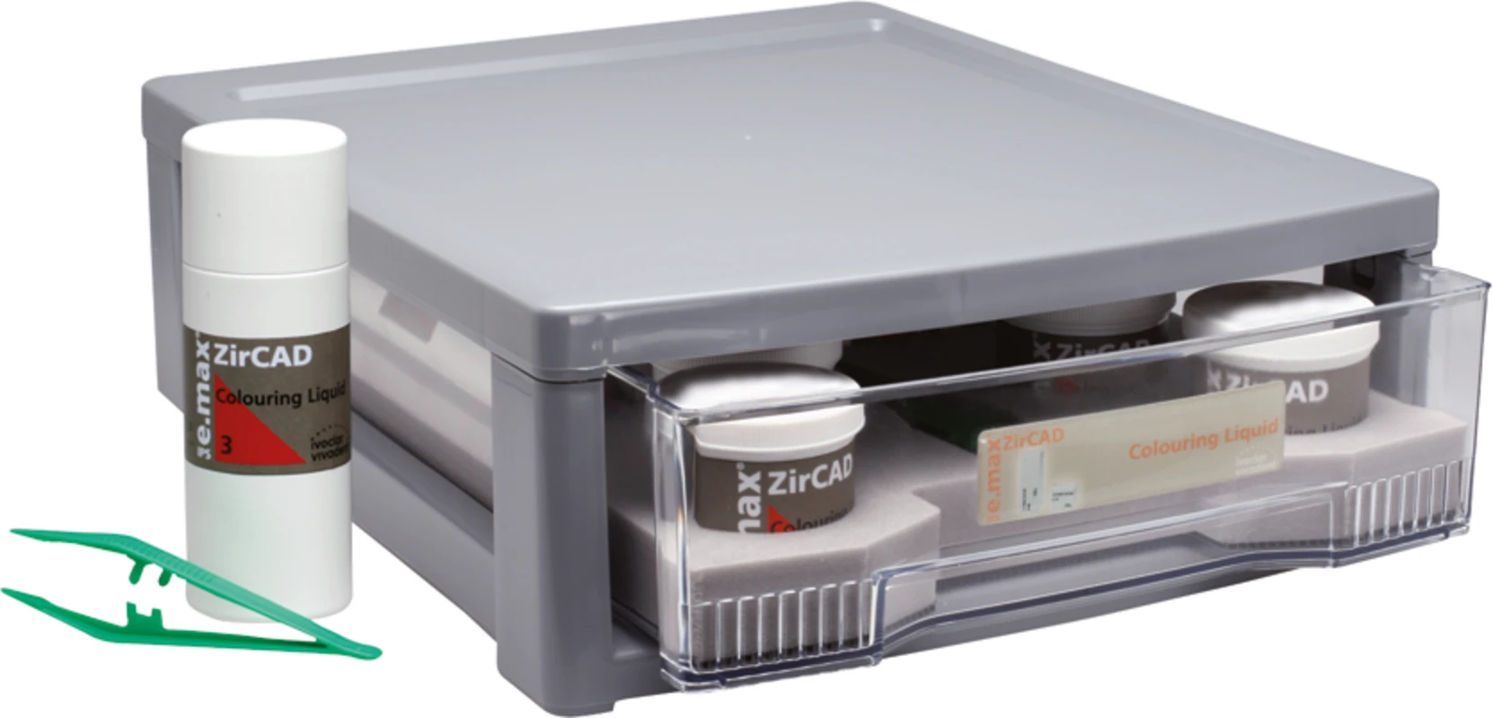 IPS e.max® ZirCAD Colouring Liquids sind gebrauchsfertige, wässrige Metallsalz-Lösungen zur Einfärbung von ungesinterten Restaurationen aus IPS e.max ZirCAD MT BL bzw. LT in der Pinselinfiltrationstechnik. IPS e.max® ZirCAD Colouring Liquid Indicator sind Farbkonzentrate in den Farben Rot, Blau und Gelb zur Einfärbung von IPS e.max® ZirCAD Colouring Liquids und dienen der Kontrolle der Farbgebung bei der Einfärbung von Zirkoniumoxidrestaurationen vor dem Sintern. Dies erleichtert die Herstellung von reproduzierbaren Farbergebnissen.