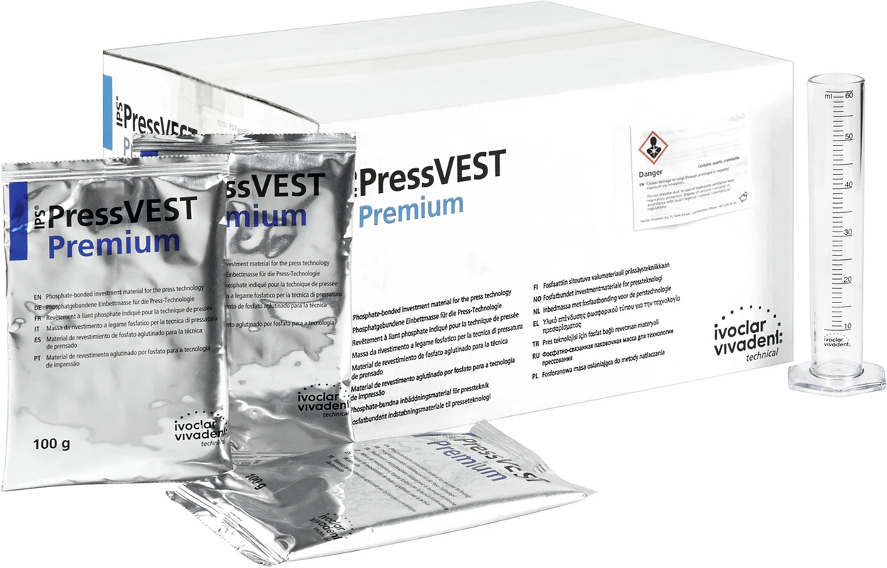 IPS® PressVEST Premium ist die universelle, phosphatgebundene Einbettmasse für Ivoclar Vivadent-Presskeramiken. Sie kann sowohl im beliebten Speed- als auch im konventionellen Aufheizverfahren verwendet werden. Besonders die minimale, leicht zu entfernende Reaktionsschicht, die glatten Oberflächen und die sehr hohe Passgenauigkeit zeichnen sie aus.