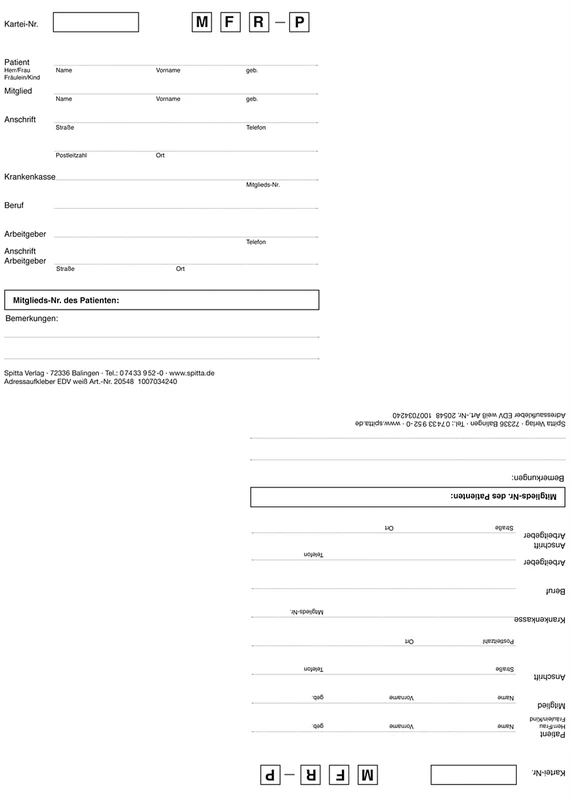Spitta-System-Karteikarte – der Klassiker in DIN A5Patientendaten und Patientendokumentationen sind das höchste Gut einer jeden Zahnarztpraxis. Gerade aus diesem Grund sollten die Voraussetzungen für den perfekten Umgang mit den sensiblen Patientendaten zu jeder Zeit gegeben sein.Mit der Spitta-System-Karteikarte (DIN A5) haben Sie alle relevanten Daten und Informationen über Ihren Patienten gesammelt zur Hand.Zur optimalen Dokumentation Ihrer Patientendaten bietet Ihnen die Karteikarte folgende Nutzungsmöglichkeiten: Alphabetleiste: Die Buchstaben der Alphabetleiste – systematisch mit Farben markiert – bieten Ihnen eine optimale Übersicht und verhindern das falsche Einsortieren in Ihrem Karteikartensystem. Heftmechanik: Separat eingeklebt in die Karteikarte sorgt die stabile Heftmechanik für eine längere Haltbarkeit Ihrer Karteikarte. Behandlungszeiträume: Auch bei geschlossener Karteikarte sehen Sie auf einen Blick, wann der Patient zuletzt behandelt wurde. Anschriftenfeld: Die Patientenstammdaten lassen sich ganz bequem mit einem Aufkleber platzieren. Zahnschema: Die Erstbefund- bzw. 01-Befundaufnahme für das Erwachsenen- und Milchzahngebiss ist zur sofortigen Beschriftung gleich auf die Karteikarte aufgedruckt. Signalreiter: Platzieren Sie bis zu 6 Signalreiter für Überwachungen und Kontrollen in Ihrer Karteikarte. Kontoführung: Behalten Sie jederzeit die Übersicht – mit der einfachen Auflistung des Patientenkontos auf der Rückseite. Optimale Dokumentation durch bewährte Karteiaufteilung Alle Patientenunterlagen und Röntgenbilder in einer Kartei sicher archivieren Leichtes Sortieren von Karteikarten durch Farbmarkierung und Reiterplatzierung Einheitliches Erscheinungsbild der Karteikarte Format: DIN A5 Maße: 21 x 14,8 cm Sonstige Infos: vorgedrucktes Anschriftenfeld Inhalt Karteikarten