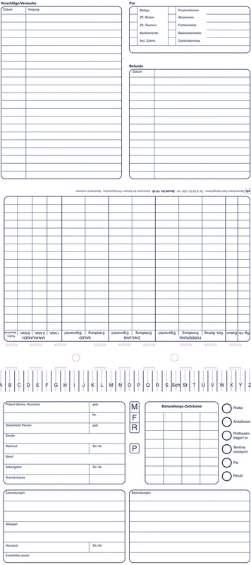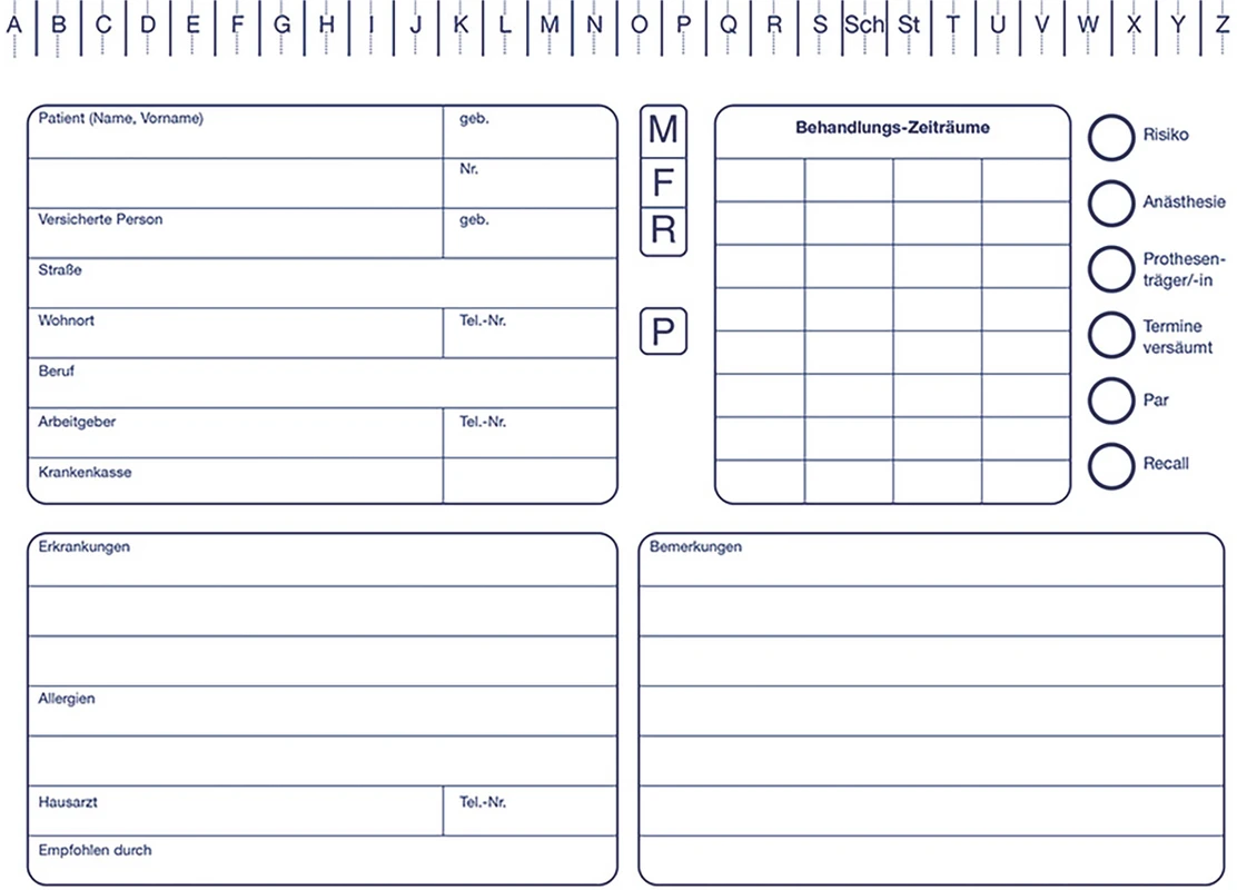 Die Karteikarten bestehen aus festem Kartonmaterial mit schmutzabweisender, glatter Oberfläche. Info-Felder auf der Außenseite und im Inneren der Karteikarte sorgen für schnelles Auffinden patientenrelevanter Daten.