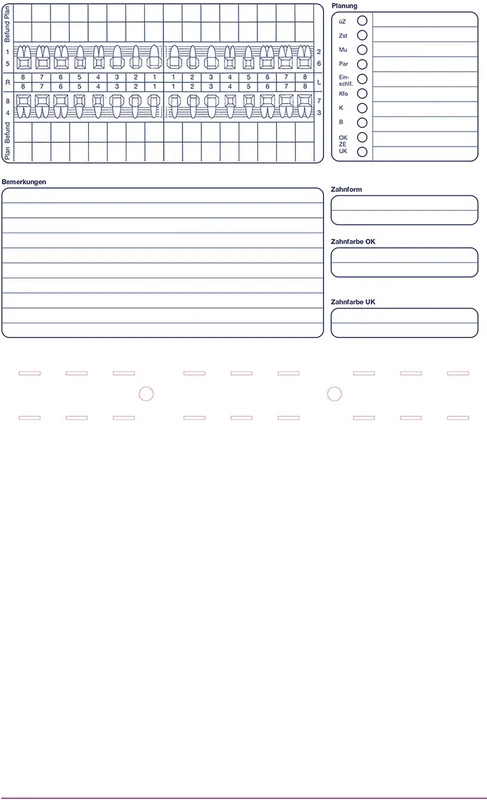 Eine Abheftmöglichkeit für Einlegeblätter und eine Tasche zur Archivierung von z. B. Röntgenaufnahmen sorgen für eine übersichtliche Dokumentation. Durch das Einsetzen von Signalreitern lassen sich wichtige Informationen wie z. B. offene Rechnungen sichtbar machen. Zur Beschriftung des Adressfeldes per EDV sind Adress--Aufkleber separat zu bestellen.
