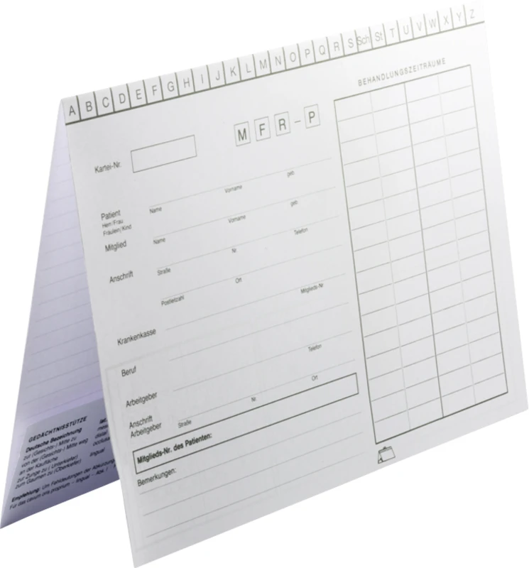 Spitta-System-Karteikarte – der Klassiker in DIN A5Patientendaten und Patientendokumentationen sind das höchste Gut einer jeden Zahnarztpraxis. Gerade aus diesem Grund sollten die Voraussetzungen für den perfekten Umgang mit den sensiblen Patientendaten zu jeder Zeit gegeben sein.Mit der Spitta-System-Karteikarte (DIN A5) haben Sie alle relevanten Daten und Informationen über Ihren Patienten gesammelt zur Hand.Zur optimalen Dokumentation Ihrer Patientendaten bietet Ihnen die Karteikarte folgende Nutzungsmöglichkeiten: Alphabetleiste: Die Buchstaben der Alphabetleiste – systematisch mit Farben markiert – bieten Ihnen eine optimale Übersicht und verhindern das falsche Einsortieren in Ihrem Karteikartensystem. Heftmechanik: Separat eingeklebt in die Karteikarte sorgt die stabile Heftmechanik für eine längere Haltbarkeit Ihrer Karteikarte. Behandlungszeiträume: Auch bei geschlossener Karteikarte sehen Sie auf einen Blick, wann der Patient zuletzt behandelt wurde. Anschriftenfeld: Die Patientenstammdaten lassen sich ganz bequem mit einem Aufkleber platzieren. Zahnschema: Die Erstbefund- bzw. 01-Befundaufnahme für das Erwachsenen- und Milchzahngebiss ist zur sofortigen Beschriftung gleich auf die Karteikarte aufgedruckt. Signalreiter: Platzieren Sie bis zu 6 Signalreiter für Überwachungen und Kontrollen in Ihrer Karteikarte. Kontoführung: Behalten Sie jederzeit die Übersicht – mit der einfachen Auflistung des Patientenkontos auf der Rückseite. Optimale Dokumentation durch bewährte Karteiaufteilung Alle Patientenunterlagen und Röntgenbilder in einer Kartei sicher archivieren Leichtes Sortieren von Karteikarten durch Farbmarkierung und Reiterplatzierung Einheitliches Erscheinungsbild der Karteikarte Format: DIN A5 Maße: 21 x 14,8 cm Sonstige Infos: vorgedrucktes Anschriftenfeld Inhalt Karteikarten