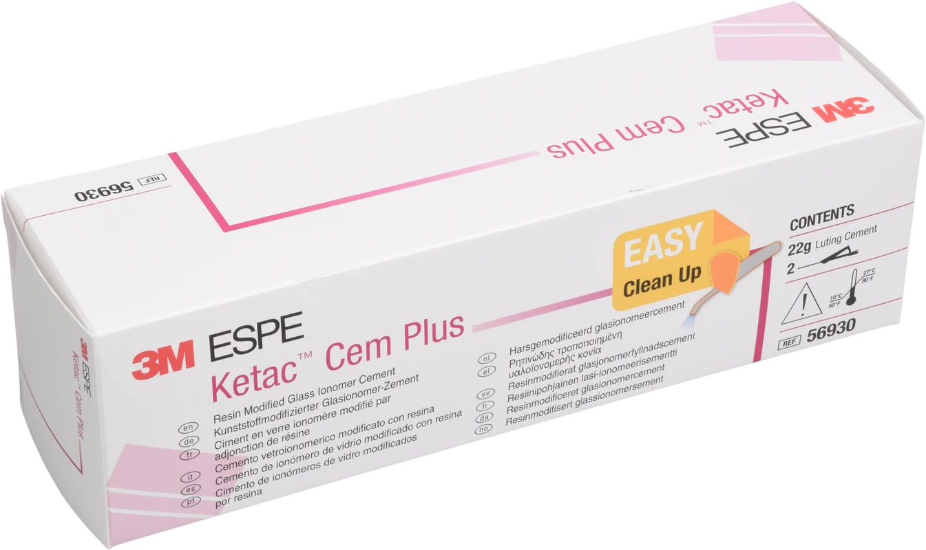 Selbsthärtend, starke Haftung, röntgenopak: 3M™ Ketac™ Cem Plus Kunststoffmodifizierter Glasionomer-Befestigungszement ist komfortabel in der Anwendung und überzeugt durch seine hohe klinische Leistung.