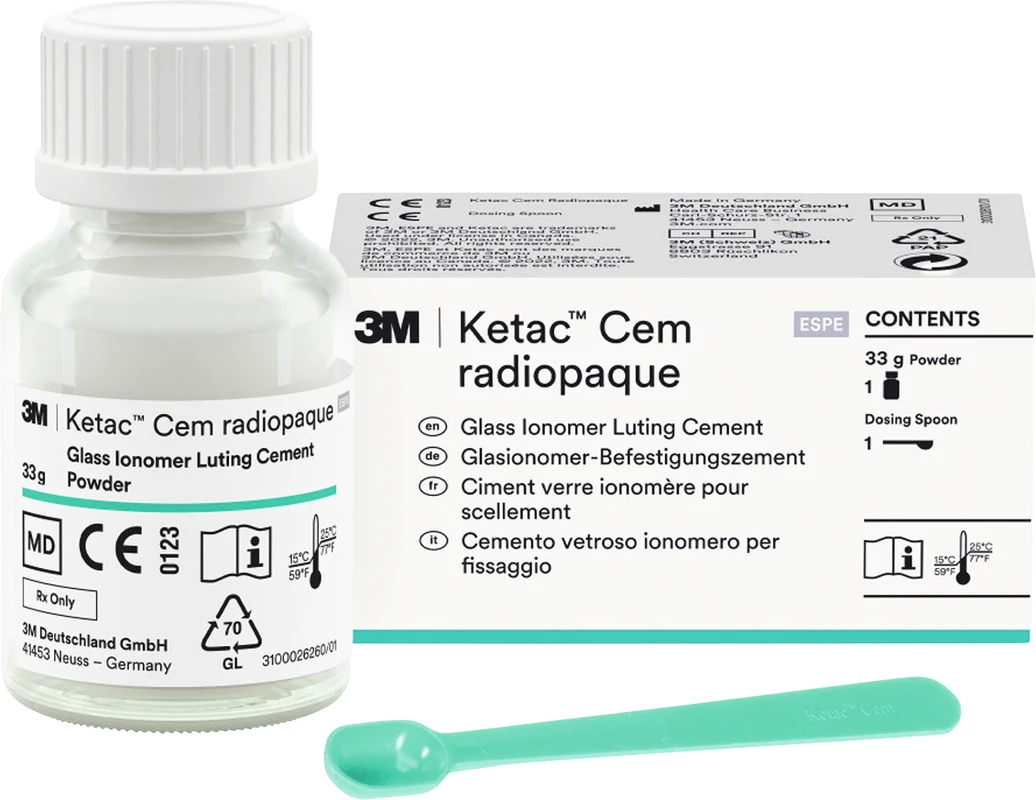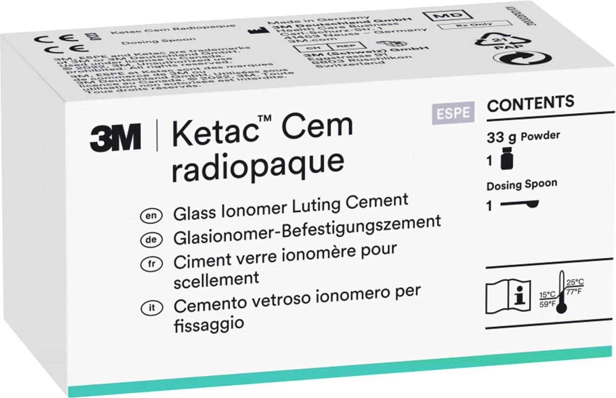 Der 3M™ Ketac™ Cem radiopaque Glasionomer-Befestigungszement mit extrem dünner Filmstärke für eine Vielzahl an Indikationen.