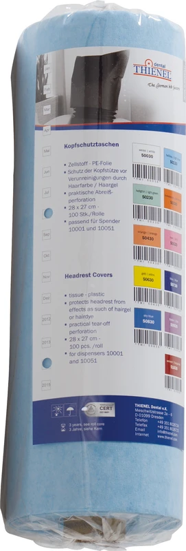 Zellstoff - PE-Folie. Schutz der Kopfstütze vor Verunreinigungen. Farblich passend zu unseren Patientenumhängen. Praktische Abreißperforation.
