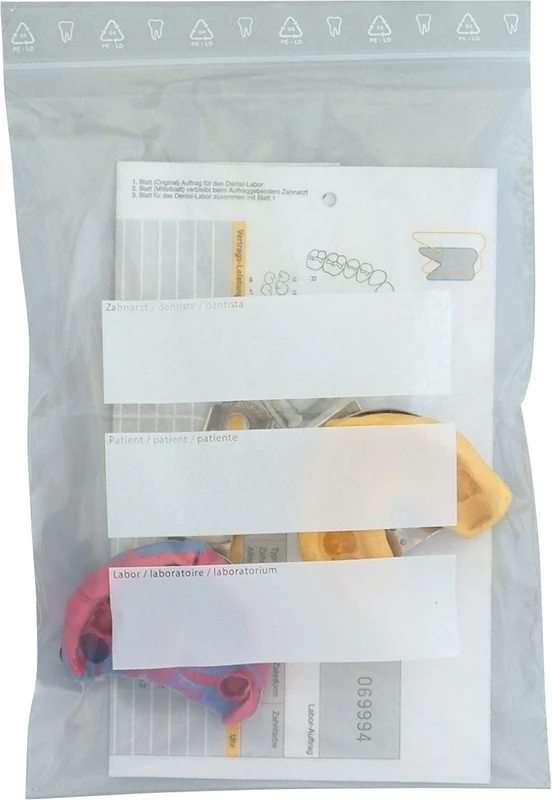 Ideal für den Versand oder die Übergabe von zahntechnischen Arbeiten – von der Abformung bis zum Modell. Durch die getrennte Aufbewahrung der Unterlagen bleibt alles hygienisch und ordentlich. Durch die Beschriftungsstreifen können wichtige Informationen vermerkt werden.