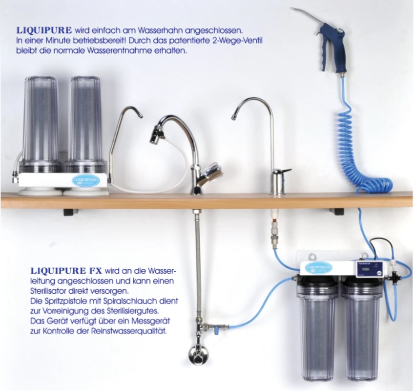 Reinstwasser aus der Leitung. LIQUIPURE- Auftischversion erzeugt aus normalem Leitungswasser demineralisiertes Wasser für alle allgemeinen Laborzwecke, Sterilisatoren, Abdampfer. LIQUIPURE entzieht dem Wasser durch ein Mischbettharz sämtliche gelösten Inhaltsstoffe. Das Wasser erfüllt die Vorgaben der RKI-Richtlinie EN13060/EN285.