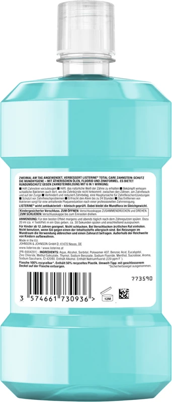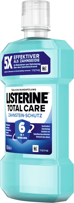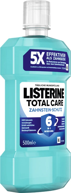 MUNDSPÜLUNG MIT RUNDUMSCHUTZ GEGEN ZAHNSTEINBILDUNG. LISTERINE® TOTAL CARE ZAHNSTEIN-SCHUTZ ist eine klinisch geprüfte Mundspülung, die durch die Zinkchlorid-Formel die Neubildung von Zahnstein hemmt. Zweimal am Tag angewendet verbessert LISTERINE® TOTAL CARE ZAHNSTEIN-SCHUTZ die Mundhygiene – mit ätherischen Ölen, Fluorid und Zinkformel und bietet Rundumschutz vor Zahnstein mit 6 in 1 Wirkung. DIE VORTEILE VON LISTERINE® TOTAL CARE ZAHNSTEIN-SCHUTZ: