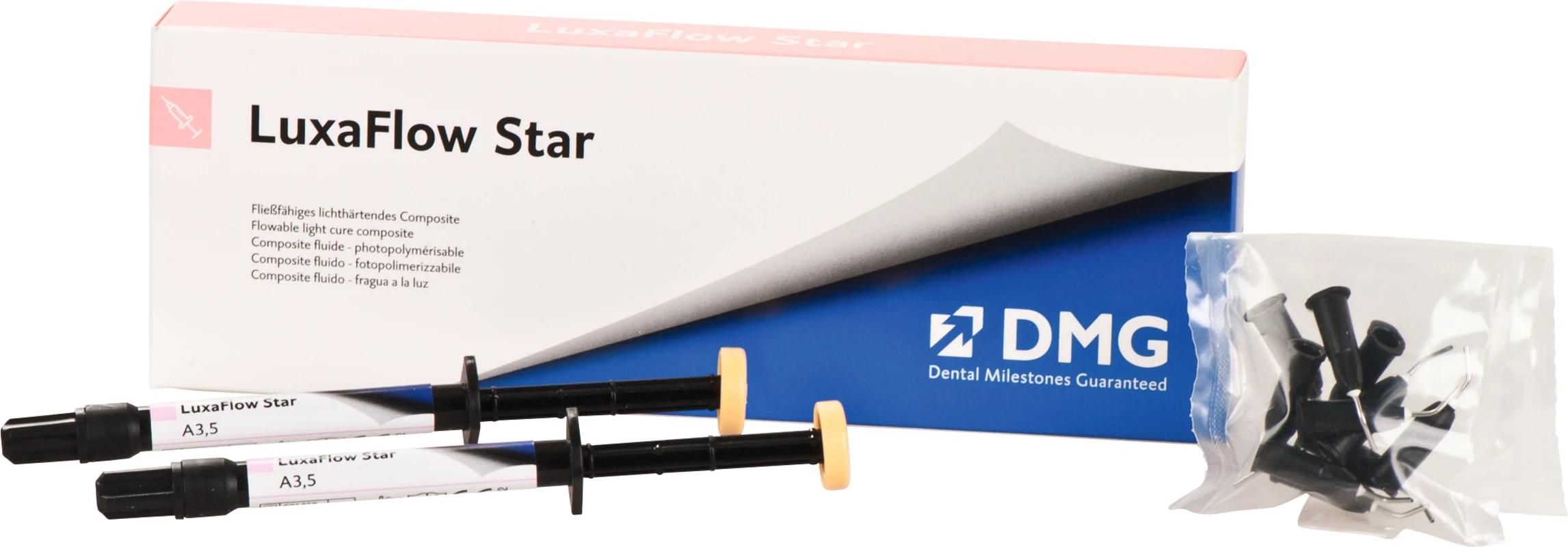 Luxatemp® Fluorescence Vorteilspackung 5 x 76 g Doppelkartusche A3, 75 Automix-TipsProduktinformationen "LuxaFlow Star Packung 2 x 1,5 g Spritze A3,5, 10 Luer-Lock Tips"