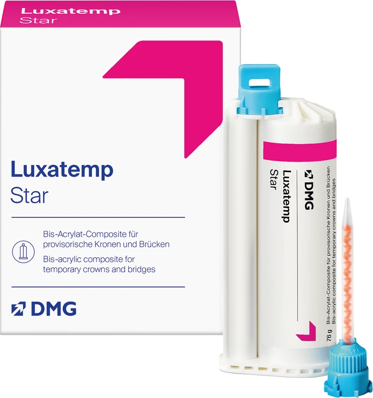 Luxatemp® Star für hochwertige provisorische Kronen und Brücken ist die Weiterentwicklung von DMG´s Erfolgsmaterial Luxatemp-Fluorescence. Das Material auf Bis-Acrylat-Basis überzeugt mit überlegener Biege- und Bruchfestigkeit und ist auch für ästhetische Langzeitprovisorien bestens geeignet. Inhalt 76 g Doppelkartusche15 Automix Tips Produktvideos: