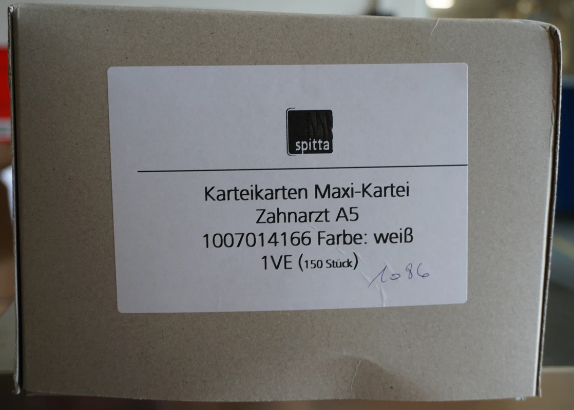 Spitta-System-Karteikarte – der Klassiker in DIN A5Patientendaten und Patientendokumentationen sind das höchste Gut einer jeden Zahnarztpraxis. Gerade aus diesem Grund sollten die Voraussetzungen für den perfekten Umgang mit den sensiblen Patientendaten zu jeder Zeit gegeben sein.Mit der Spitta-System-Karteikarte (DIN A5) haben Sie alle relevanten Daten und Informationen über Ihren Patienten gesammelt zur Hand.Zur optimalen Dokumentation Ihrer Patientendaten bietet Ihnen die Karteikarte folgende Nutzungsmöglichkeiten: Alphabetleiste: Die Buchstaben der Alphabetleiste – systematisch mit Farben markiert – bieten Ihnen eine optimale Übersicht und verhindern das falsche Einsortieren in Ihrem Karteikartensystem. Heftmechanik: Separat eingeklebt in die Karteikarte sorgt die stabile Heftmechanik für eine längere Haltbarkeit Ihrer Karteikarte. Behandlungszeiträume: Auch bei geschlossener Karteikarte sehen Sie auf einen Blick, wann der Patient zuletzt behandelt wurde. Anschriftenfeld: Die Patientenstammdaten lassen sich ganz bequem mit einem Aufkleber platzieren. Zahnschema: Die Erstbefund- bzw. 01-Befundaufnahme für das Erwachsenen- und Milchzahngebiss ist zur sofortigen Beschriftung gleich auf die Karteikarte aufgedruckt. Signalreiter: Platzieren Sie bis zu 6 Signalreiter für Überwachungen und Kontrollen in Ihrer Karteikarte. Kontoführung: Behalten Sie jederzeit die Übersicht – mit der einfachen Auflistung des Patientenkontos auf der Rückseite. Optimale Dokumentation durch bewährte Karteiaufteilung Alle Patientenunterlagen und Röntgenbilder in einer Kartei sicher archivieren Leichtes Sortieren von Karteikarten durch Farbmarkierung und Reiterplatzierung Einheitliches Erscheinungsbild der Karteikarte Format: DIN A5 Maße: 21 x 14,8 cm Sonstige Infos: vorgedrucktes Anschriftenfeld Inhalt Karteikarten