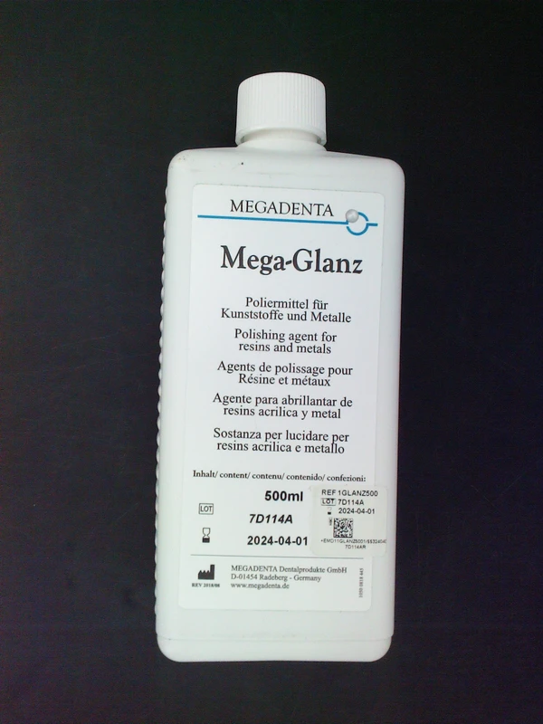 Mega-Glanz ist ein Hochglanz-Poliermittel für Kunstoff- und Metallarbeiten sowie für kombinierte Kunststoff/Metallprothesen. Durch die feine flüssige Konsistenz ist die Politur direkt am Arbeitsplatz des Technikers möglich. Mega-Glanz ist vor Austrocknung geschützt.