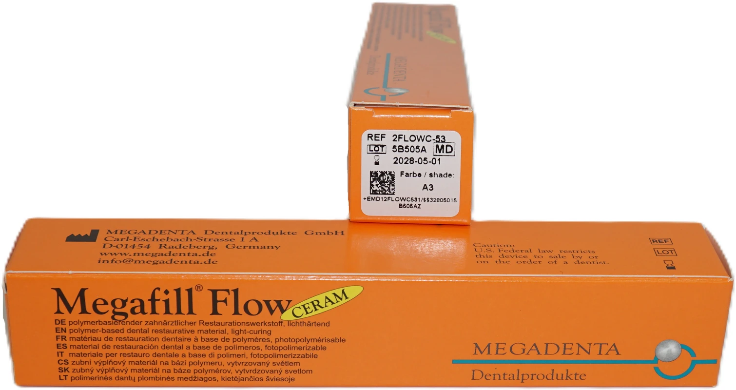 Megafill Flow CERAM ist ein fließfähiges lichthärtendes röntgenopakes Microhybrid Composite. Megafill Flow CERAM besitzt die natürliche Fluoreszenz und wird in der Füllungstherapie bei Mikropräparationen und Zahnhalsdefekten, der erweiterten Fissurenversiegelung, der Fixierung und Reparatur von Composite- und Keramikrestaurationen sowie zum Legen der ersten Zahnfüllschicht bei Compositerestaurationen angewandt. Durch eine leicht thixotrope Konsistenz tropft Megafill Flow CERAM nicht und lässt sich punktgenau applizieren. Dabei wird eine hohe Standfestigkeit des Materials gewährleistet. Eine ausgewogene Transparenz und die Kombinierbarkeit mit Füllungsmaterialien, z.B. Megafill MH CERAM ermöglichen eine optimale Anwendungsbreite für Megafill Flow CERAM. Durch eine Matrix mit Microglass-Füller wird Megafill Flow hochglanzpolierbar und abrasionsfest. Megafill Flow wird in den gängigen Grundfarben angeboten.
