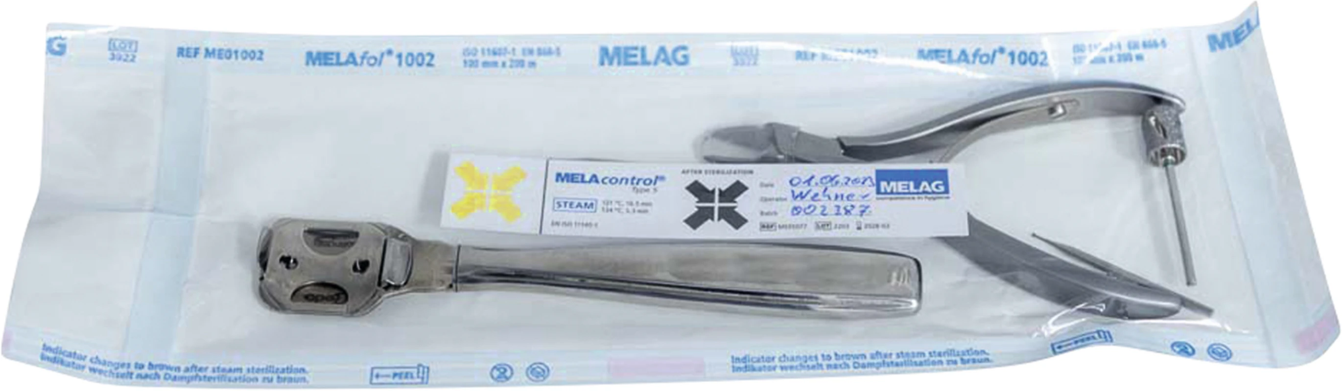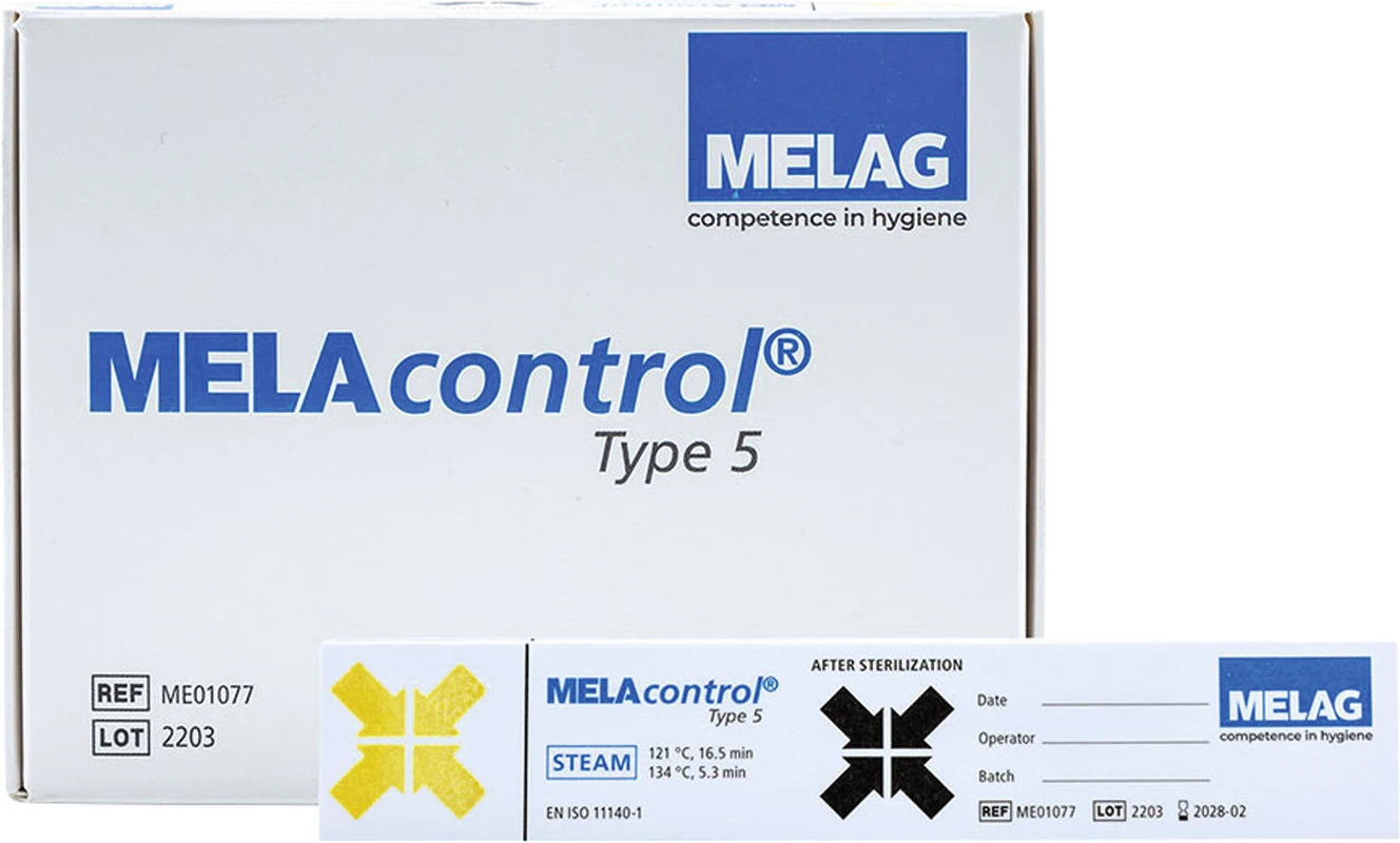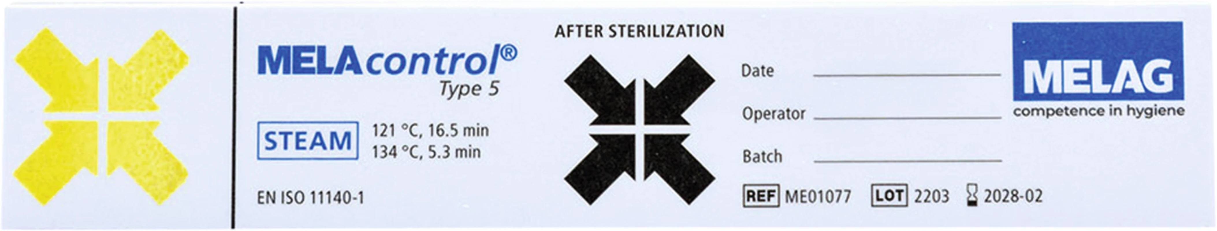 Indikator nach EN ISO 11140-1 zur Überprüfung der Sterilisationsbedingungen (Dampf, Temperatur und Zeit). Der Indikator kann sowohl verpackten Instrumenten (z.B.in MELAfol, MELAstore) beigelegt, als auch direkt im Kessel platziert werden.Bei Einhaltung der Sterilisationsbedingungen schlägt der Indikator bei 121 °C nach 16,5 min. oder bei 134 °C nach 5,3 min. um. Der gebrauchsfertige Indikator dient der einmaligen Nutzung und wird in einer praktischen Box mit 250 Indikatorstreifen geliefert.