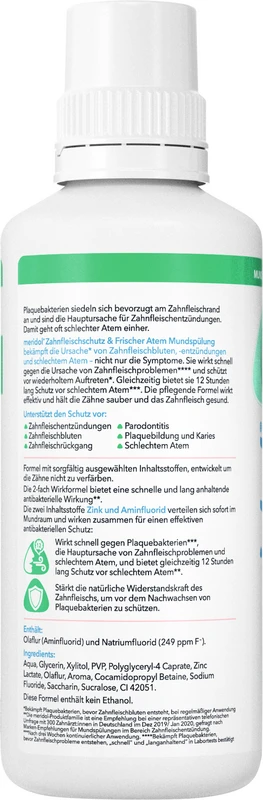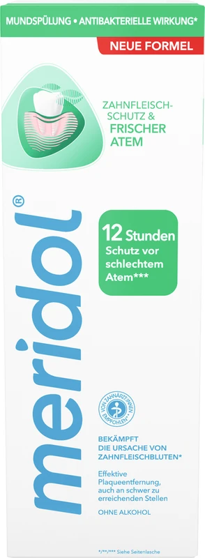 meridol® ZAHNFLEISCHSCHUTZ & FRISCHER ATEM Mundspülung bekämpft die Ursache* von Zahnfleischbluten und -entzündungen und bietet 12 Stunden Schutz vor schlechtem Atem***.