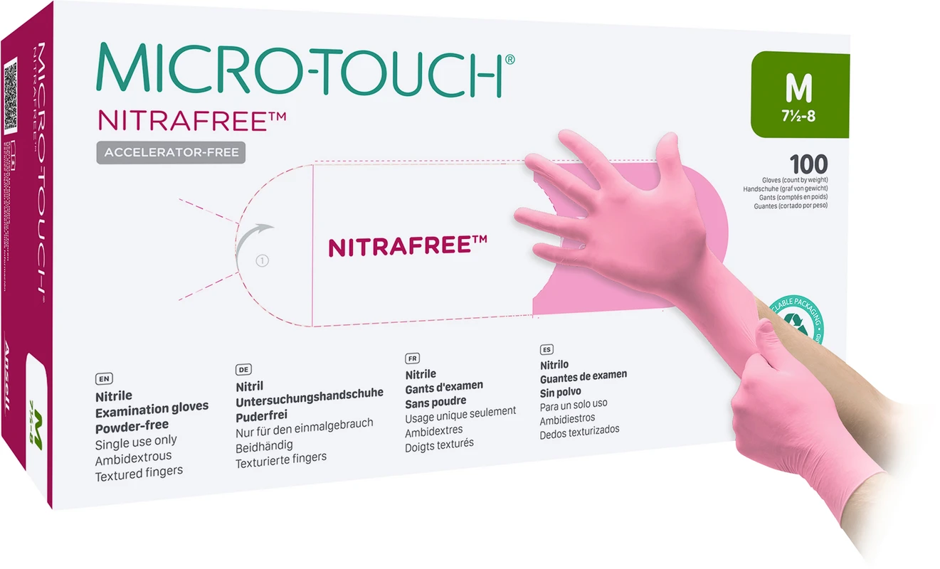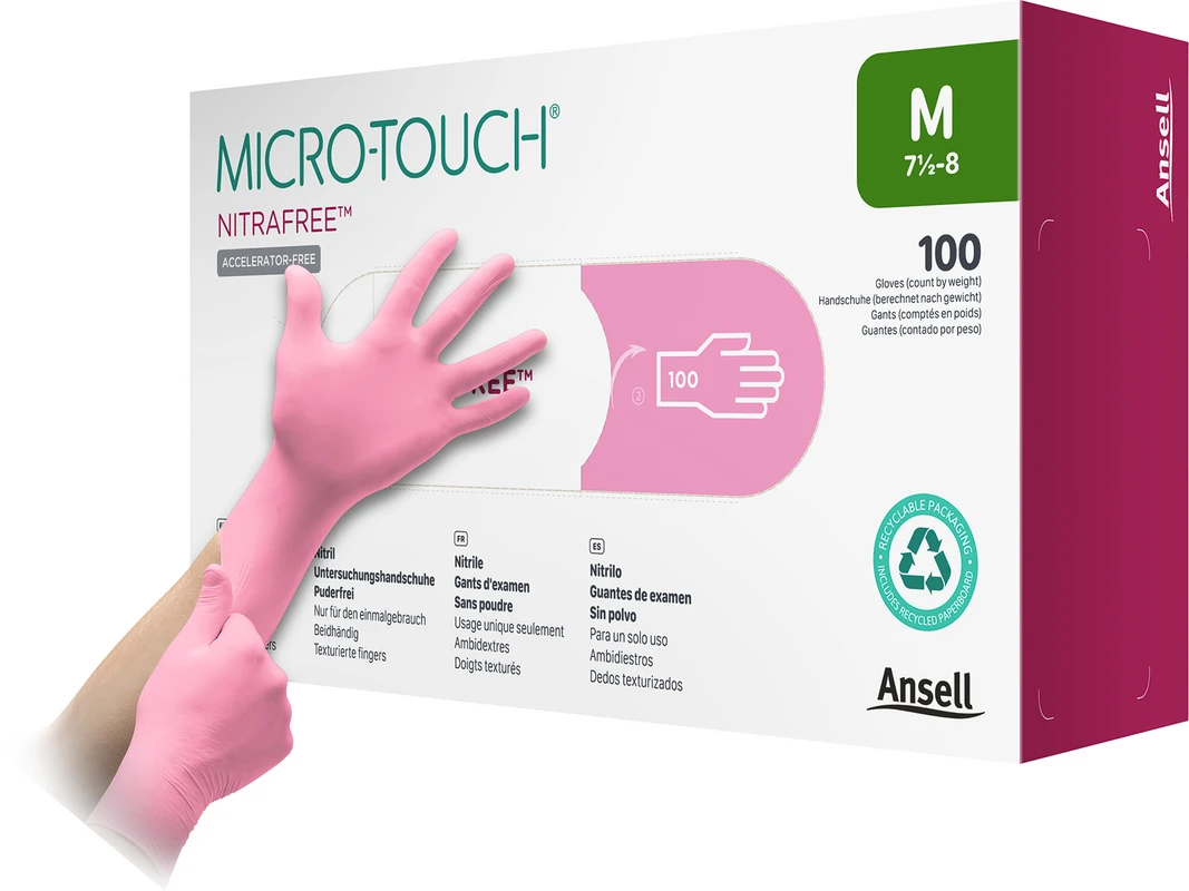 Die MICRO-TOUCH® NITRAFREE™ Nitril-Untersuchungshandschuhe™ bestehen aus einer strapazierfähigen und weichen Nitrilformulierung, die ohne chemische Beschleuniger hergestellt wird und den Benutzer vor chemischen Allergien vom Typ IV schützt. Bietet komfortablen und zuverlässigen Schutz und unterstützt gleichzeitig die Brustkrebsforschung.