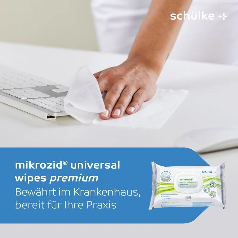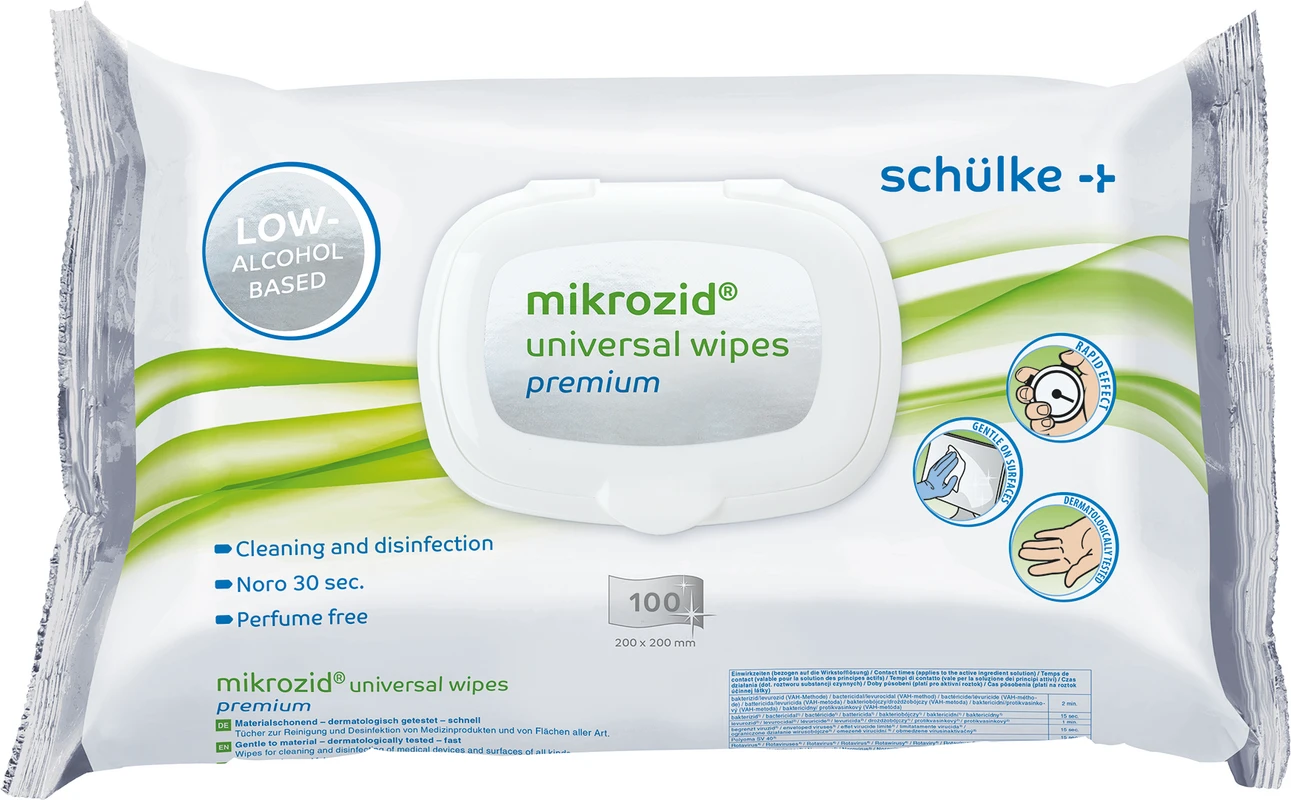 Gering alkoholische Tücher zur Schnelldesinfektion von Medizinprodukten und andere Flächen.