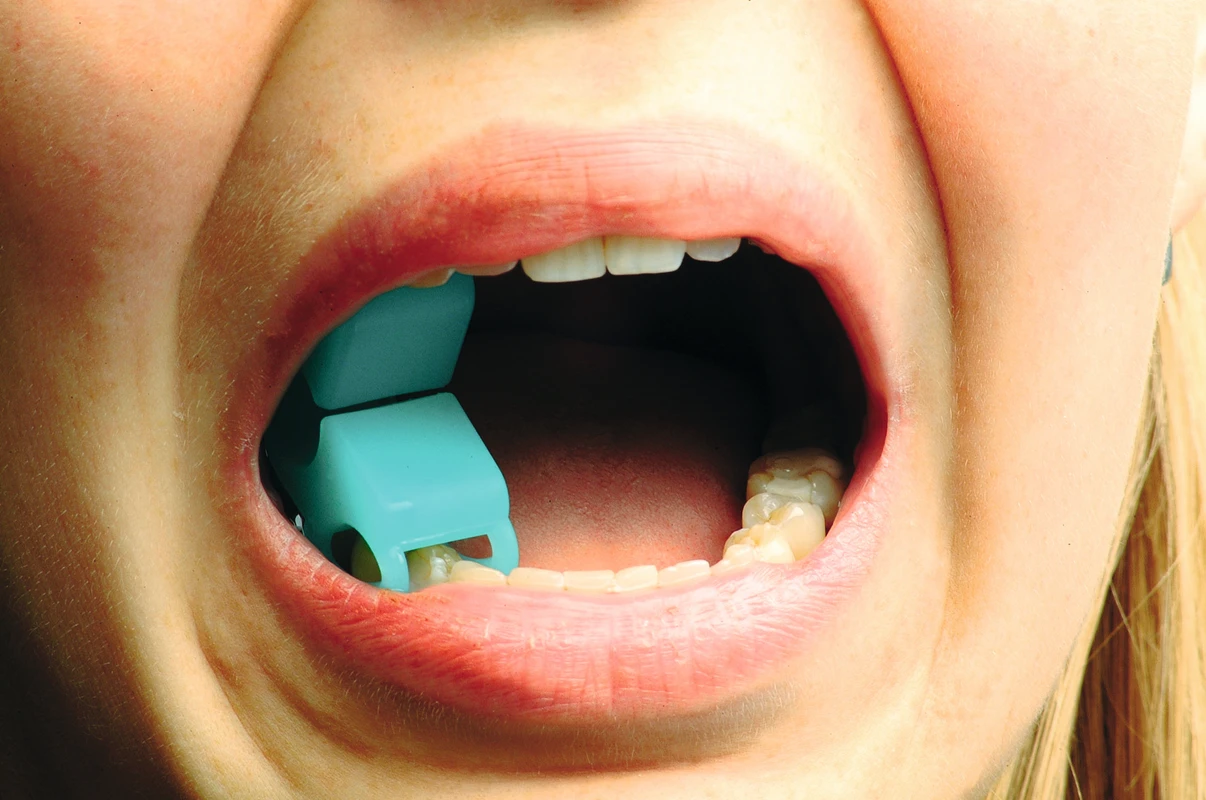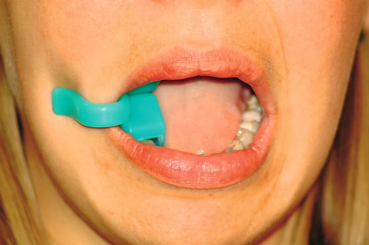 - Autoklavierbarer Kunststoffblock wird zwischen OK und UK geschoben und hält zuverlässig den Biss offen
