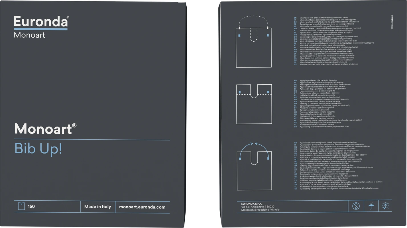 Bib Up! Patientenumhänge gibt es in XX klassischen Monoart-Farben. Sie bestehen aus einer Lage besonders saugfähiger Zellulose, die Spritzer und Feuchtigkeit aufnimmt. Die zweite Lage, eine darunter liegende Folie, verhindert ein Durchnässen. So bleibt Patientenkleidung sauber und trocken. Die Umhangform eignet sich besonders für die Prophylaxe oder bei medizinisch-kosmetischen Anwendungen. Die Touch-On-Befestigung der Monoart Bib Up! kann besonders bei ängstlichen Patient:innen eine gute Alternative sein. Der leichte Schulterdruck beim Anbringen wirkt wie eine sanfte Berührung. Der Verzicht auf halsumschließende Befestigung verhindert ein Enge-Gefühl. Ein Spender-Karton Monoart Bib Up! enthält 150 einzeln entnehmbare Umhänge. Er passt in handelsübliche Schubladen von medizinischen Möbelzeilen und erlaubt so eine hygienische Lagerung und bequeme Entnahme.