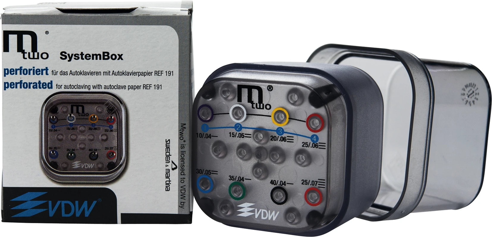 Mtwo® Blisterpackung 6 Instrumente ABT 21 mm, 31 mm, Taper.04, ISO 040Produktinformationen "Mtwo® Systembox leer Stück mit Deckel transparent"