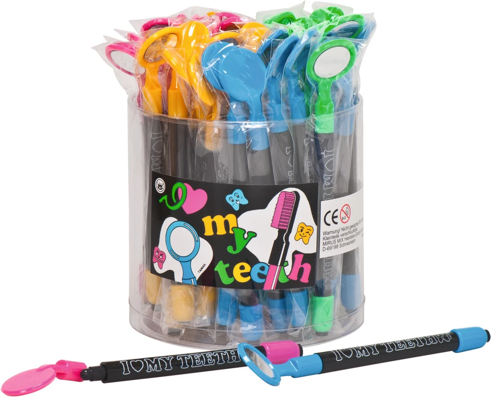 Mundspiegel "Radiergummi" hat zwei Funktionen: zum einen kann mit diesem Mundspiegel eine Putzkontrolle durchgeführt werden, zum anderen kann man ihn als Radierer benutzen.