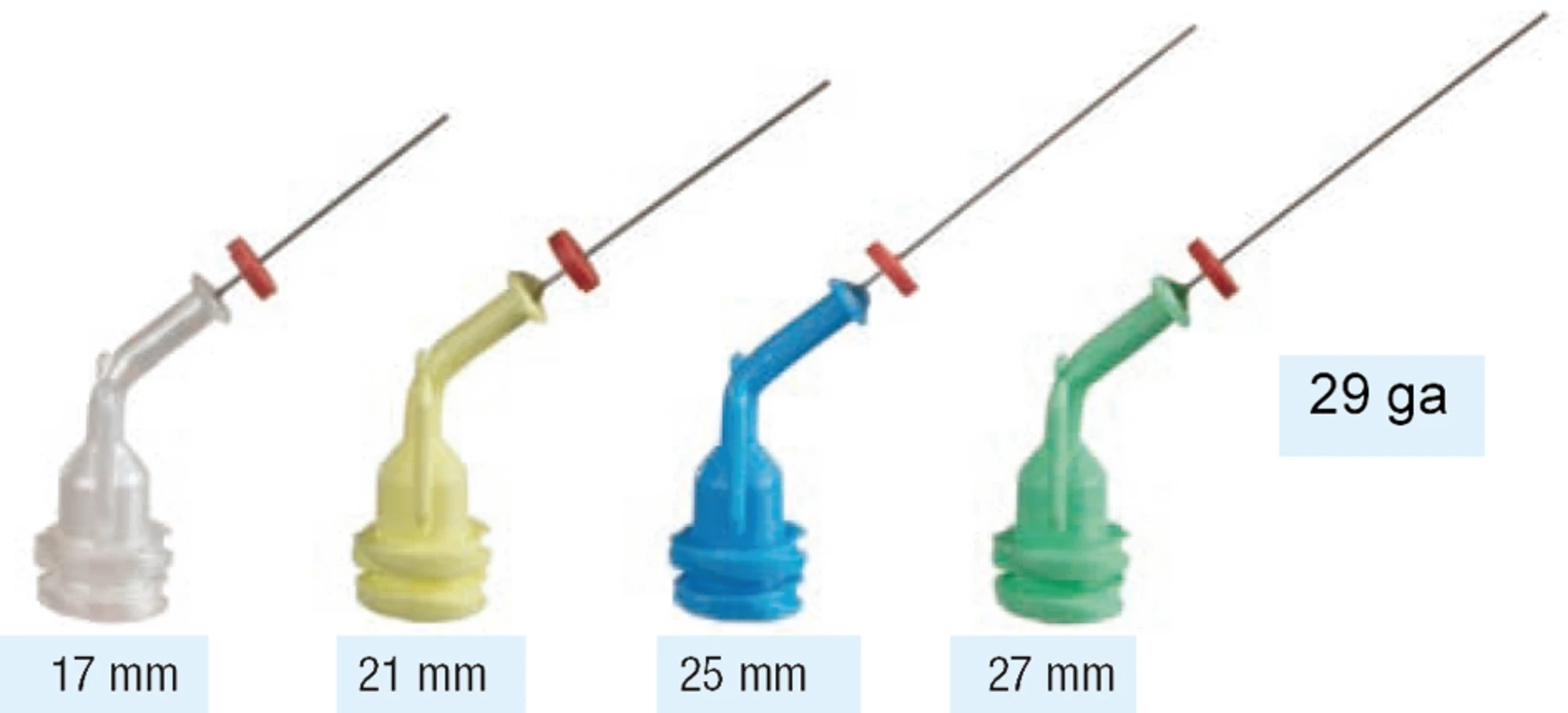 Feinste Metallkanülen mit gebogenem Kunststoff-"Hals". Sie sind im apikalen Drittel weich und biegsam, auf der übrigen Länge elastisch federnd. So kann man diese Kanüle wie Endo-Nadeln in den Wurzelkanal einführen, ohne dass sie abknicken.