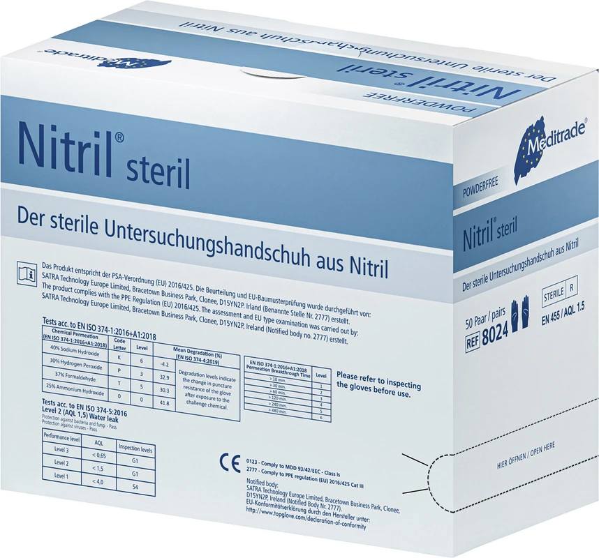 Produktinformationen "Nitril® steril Packung 50 Paar Handschuhe blau steril, puderfrei, latexfrei, Größe M"