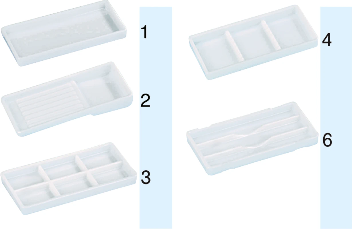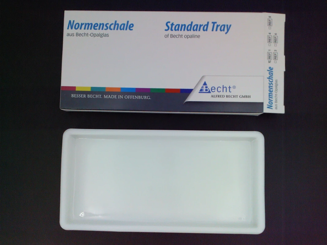 Die Normenschalen aus Opalglas sind in den unterschiedlichen Größen erhältlich und mit Einteilungen zur übersichtlichen Aufbewahrung von Instrumenten.