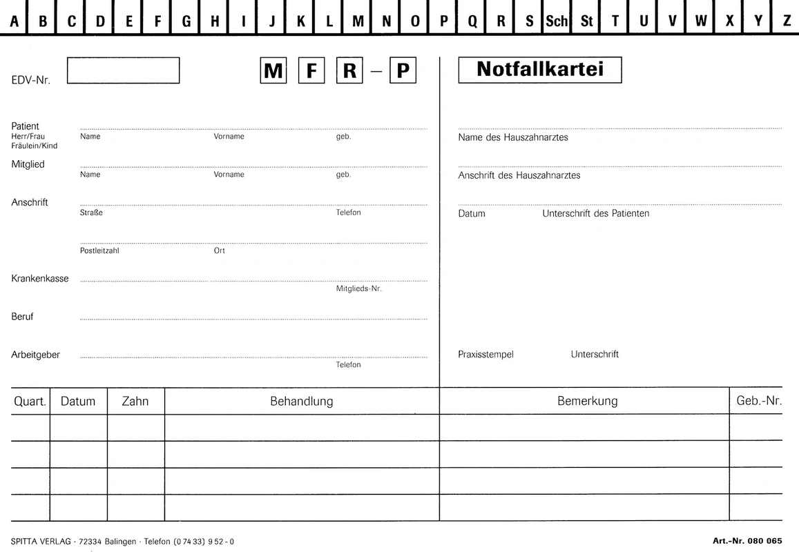 Das Handling ist denkbar einfach: ein Exemplar für den weiterbehandelnden Zahnarzt und einen Karteibeleg mit Alphabetleiste für Ihre Patientenkartei.