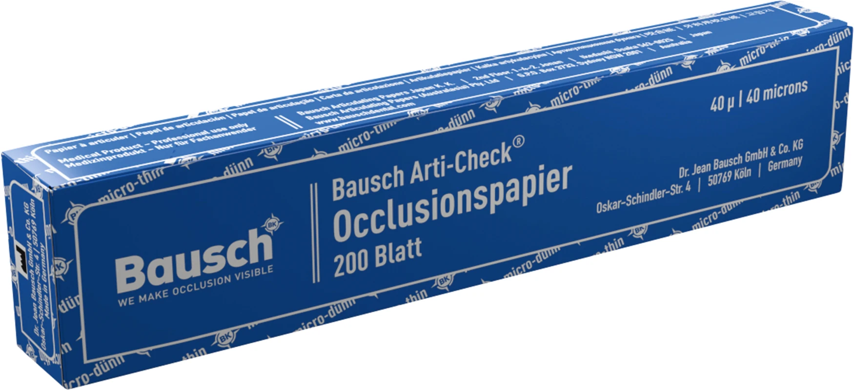 Das Occlusionspapier Arti-Check® eignet sich optimal zur Analyse von Okklusion und Artikulation in der zahnärztlichen Diagnostik. Durch die mikrodünne Struktur werden auch feinste Kontaktpunkte exakt sichtbar gemacht, ohne den Biss zu verfälschen.