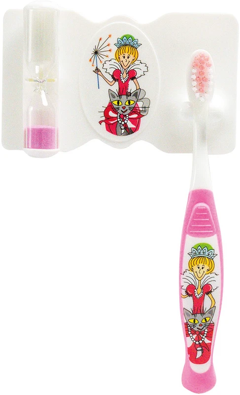 Omni Kinderset ist das ideale Praxispräsent, bestehend aus einem selbstklebenden Wandhalter mit Sanduhr für die Überprüfung der Zahnputzzeit und einer hochwertigen Kinderzahnbürste für die Altersklasse 3 – 7 Jahre. In zwei Versionen: Ritter und Fee.