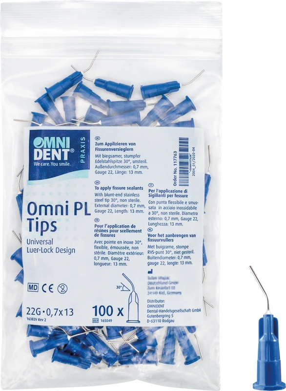 Omni PL Tips – G19, biegsame Applikationsspitzen, 13 mm, Ø 1,1 mm, 30°, 100 Stück Präzise Applikation leicht gemacht: Die Omni PL Tips mit biegsamer, stumpfer Edelstahlspitze eignen sich ideal für die gezielte Applikation von Flüssigkeiten oder Gelen in der zahnärztlichen Behandlung. Mit der abgebogenen Spitze ermöglichen sie ein sicheres, kontrolliertes Auftragen auch an schwer zugänglichen Stellen. Produktvorteile – Biegsame Applikationsspitze aus stumpfem Edelstahl – individuell anpassbar – 30°-Winkel – für präzisen Zugang zu schwer erreichbaren Bereichen – Ideal zum Applizieren von Flüssigkeiten, Gelen oder Pasten – Unsteril – für den Einmalgebrauch vorgesehen – Kompatibel mit gängigen Applikationsspritzen – Packung mit 100 Stück – wirtschaftlich & praxisgerecht Anwendung & Zusatzinfos Die Omni PL Tips sind vielseitig einsetzbar, z. B. in der Füllungstherapie oder beim Auftragen von Fluoridgelen. Dank der biegsamen Edelstahlspitze lassen sie sich exakt an die Anforderungen der Behandlung anpassen. Inhalt: 100 Applikationstips, L 13 mm, Ø 1,1 mm, 30°, G19 Jetzt bestellen Jetzt Omni PL Tips online bei dentalkiosk.de bestellen – für präzise, flexible Applikation im Behandlungsalltag.