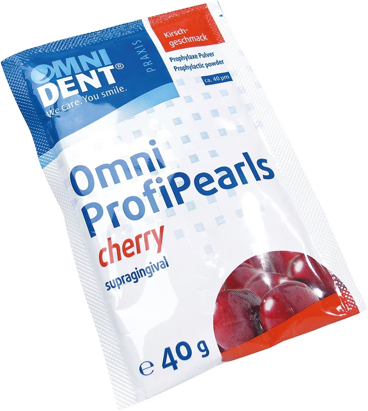 Omni ProfiPearls ist ein Prophylaxepulver auf Basis von Natriumhydrogencarbonat. Ideal für die supragingivale Entfernung von hartnäckigen Belägen und Verfärbungen. Geeignet für den Einsatz in den meisten herkömmlichen Pulverstrahlgeräten, z. B. der smartgun One. Das Pulver hat eine Korngröße 40-50μ. Die Omni ProfiPearls gibt es in den Geschmacksrichtungen Lemon, Cassis, Cherry und Mint.