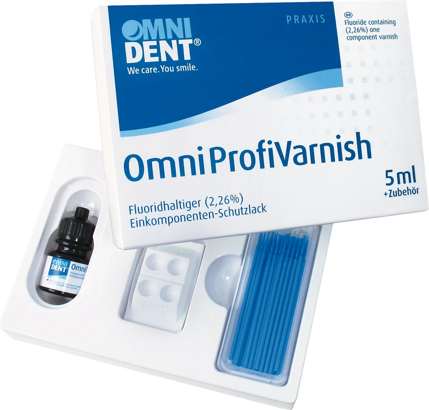 Das Omni ProfiVarnish ist ein fluoridhaltiger Einkomponenten-Schutzlack bzw. –gel, das zur Desensibilisierung von Zähnen auf Schmelz- und Dentinoberflächen aufgetragen wird. Zur Behandlung von hypersensiblen Zähnen, freiliegenden Zahnhälsen und Zahnöberflächen während und/oder nach der kieferorthopädischen Behandlung. Omni ProfiVarnish enthält neben leicht löslichen Fluoriden zusätzlich Calciumfluorid und Fluorapatit, welches die Remineralisierung von der Zahnsubstanz unterstützt. Omni ProfiVarnish enthält 22.600 ppm (2,26 %) Fluoride.