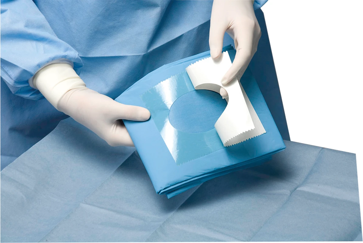Saugfähiges/Flüssigkeitsfestes Abdecktuch mit verklebbarer Öffnung.
