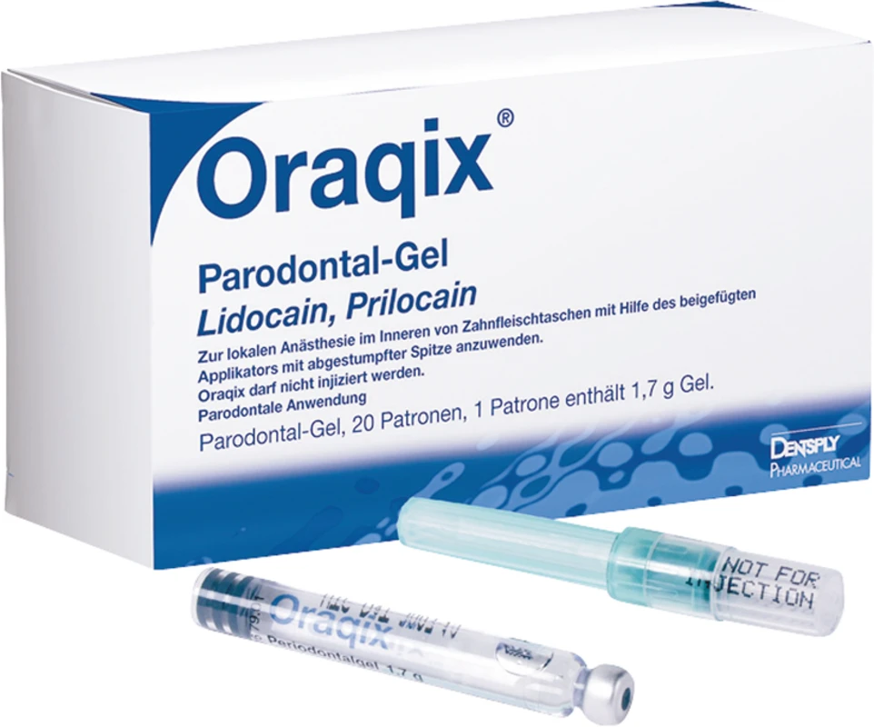 Produktinformationen "Oraqix® Lidocain und Prilocain Parodontal-Gel 2,5%/2,5% Packung 20 x 1,7 g Patrone, 20 Applikatoren"