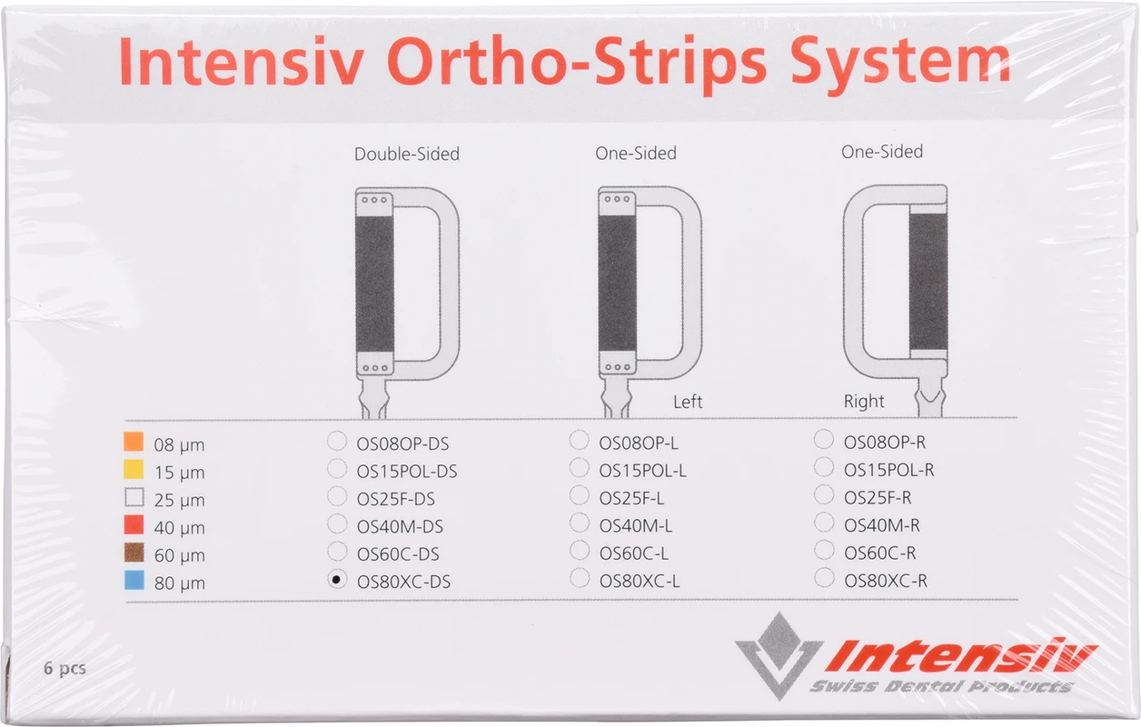 Oszillierende Diamantstrips für die interdentale doppelseitige Zahnschmelzreduktion in der Kieferorthopädie (Stripping). Bei der Öffnung des Interdentalraumes und der Reduktion, Finierung und Politur des Zahnschmelzes in der Kieferorthopädie sind Rillen und Kratzer zu vermeiden. Die Zahnschmelzreduktion wird schrittweise, unter Verwendung von grober bis feiner Körnung, durchgeführt. Mit dem Intensiv Ortho-Strips System ist gegenüber den manuellen Strips eine rasche kontrollierte Zahnschmelzreduktion mit anschliessender Politur ohne unnötige Entfernung von gesunder Zahnhartsubstanz möglich.