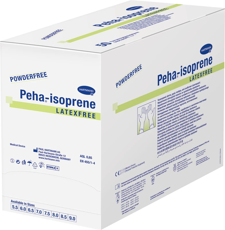 Latex- und puderfreie Einmal-OP-Handschuhe aus besonders dünnem und weichem 100 % synthetischem Polyisopren, durch Polymer-Innenbeschichtung leicht anzuziehen, mikrogeraute Oberfläche, ausgezeichnetes Tastempfinden, hochelastisch und reißfest, ermüdungsfreier Sitz durch vollanatomische Passform. Peha-isoprene® latexfree ist ein Medizinprodukt nach EN 455 und Persönliche Schutzausrüstung nach EN 374. Geeignet für den Einsatz mit Zytostatika und Chemikalien. Empfohlen als Überziehhandschuh in Kombination mit Peha-underglove latexfree. Er erreicht ein AQL Niveau von 0,65.