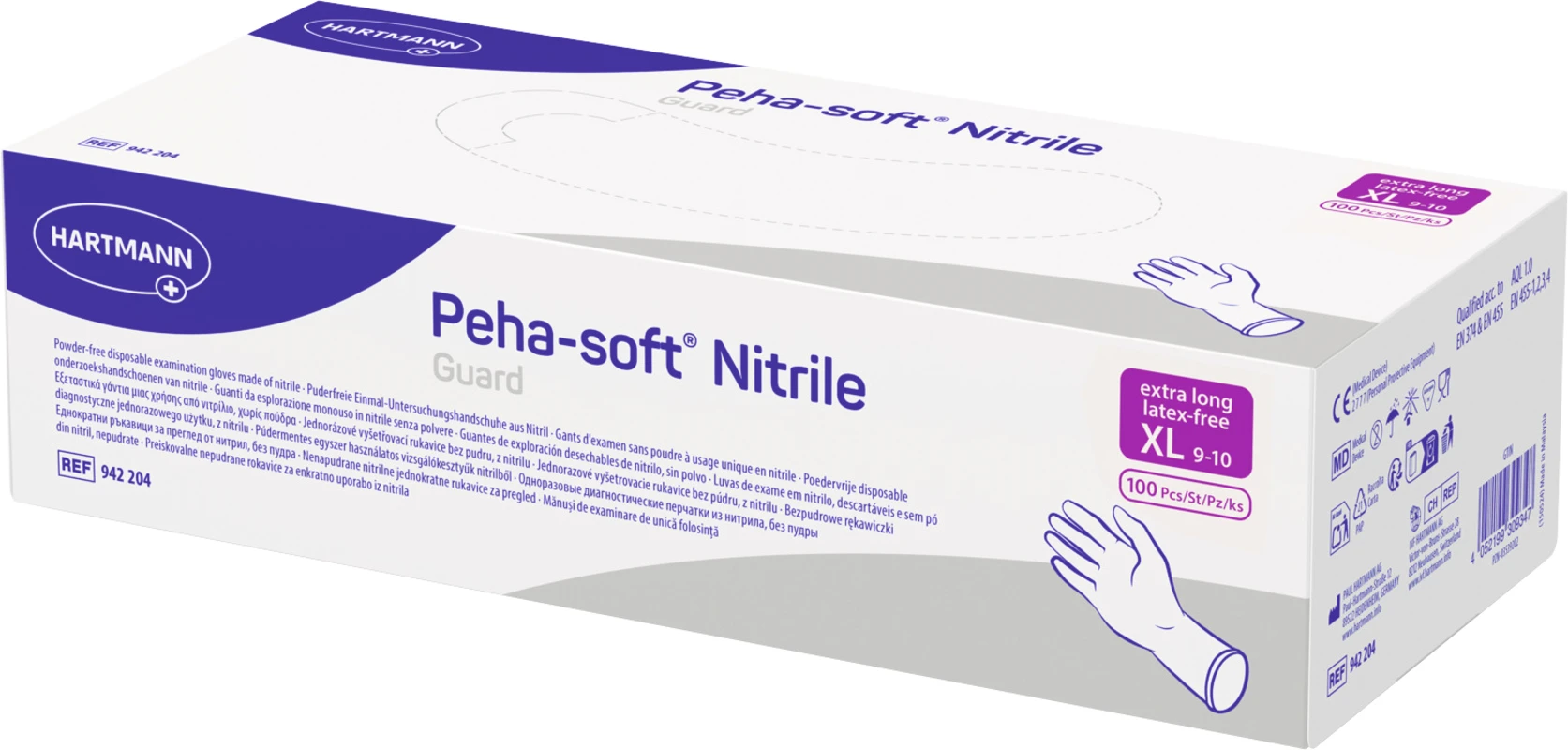 Latexfreie Einmal-Untersuchungs- und Schutzhandschuhe aus weichem, blau gefärbtem Nitrilkautschuk, puderfrei, mit extra langer Stulpe für optimalen Schutz, durch chlorierte Innenbeschichtung leicht anzuziehen, texturierter Fingerbereich für optimale Griffigkeit, hochelastisch undbesonders reißfest, hervorragende Passform und ausgezeichnetes Tastempfinden, links und rechts zu tragen.AnwendungAls strapazierfähiger medizinischer Handschuh zum einmaligen Gebrauch in allen Bereichen, in denen das Personal durch Kontamination gefährdet ist. Insbesondere geeignet für Personen, die auf Handschuhpuder überempfindlich reagieren oder mit Allergien gegen Latexproteine (Typ-I-Allergie). Medizinprodukt nach EN 455 und Persönliche Schutzausrüstung nach EN 374 Kategorie III für den Einsatz im Labor und beim Umgang mit Chemikalien und Desinfektionsmitteln. Zugelassen für den Kontakt mit Lebensmitteln.