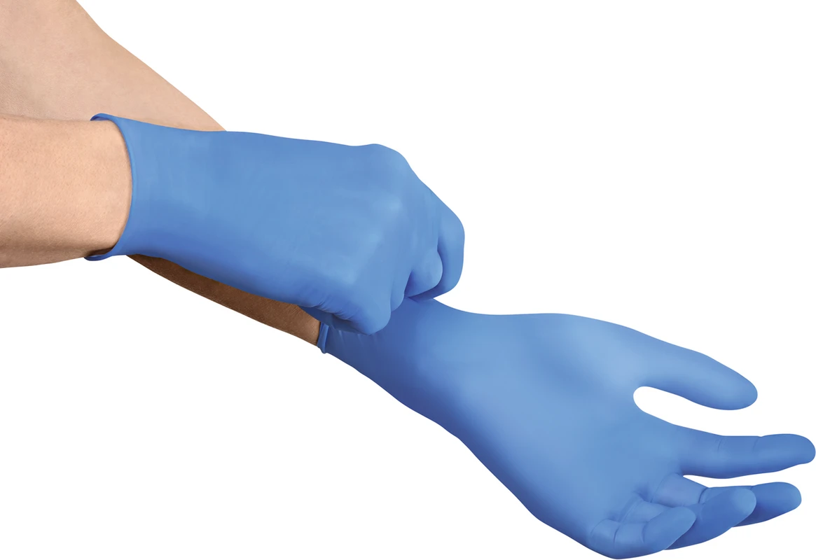 - Sterile Einmal-Untersuchungs- und Schutzhandschuhe aus weichem, blau gefärbtem Nitrilkautschuk