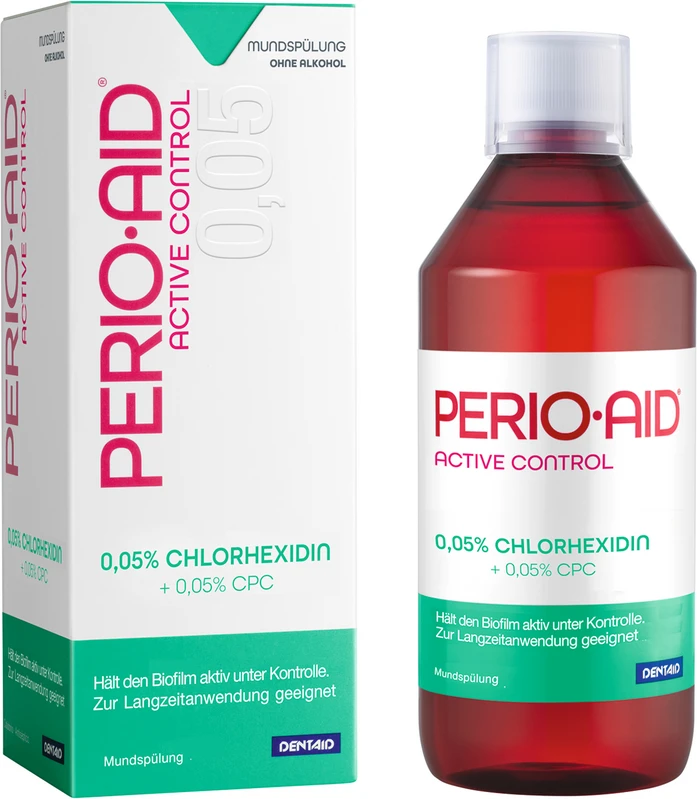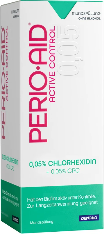 PERIO AID® Active Control verhindert die Bildung von Zahnbelag, bekämpft Entzündungen im Mundraum und trägt zur aktiven Biofilmkontrolle bei. Durch die alkoholfreie Zusammensetzung, ist sie besonders schonend zur Mundschleimhaut.