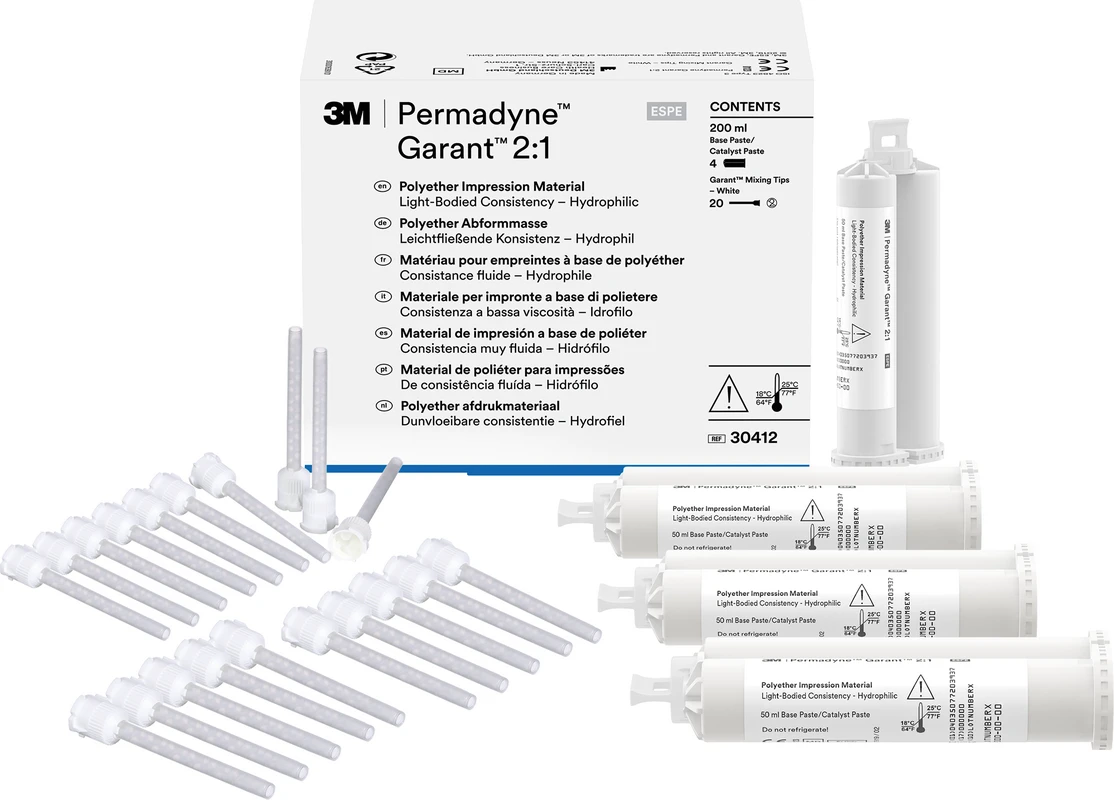 3M™ Permadyne™ Polyether Präzisionsabformmaterial in fester und dünner Konsistenz für die Doppelmischtechnik bzw. Handmischversion oder zum automatischen Anmischen und Dosieren im 3M™ Pentamix™ bzw. 3M™ Garant™ System.