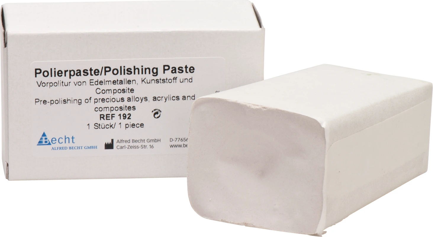 Universell einsetzbare Paste zur Vorpolitur von Edelmetallen, Kunststoff und Composites. Diese Polierpaste kann auch alternativ zu Bimssteinprodukten eingesetzt werden, ist durch ihre weiche Konsistenz effizient zu dosieren und verursacht am Arbeitsplatz eine geringere Verschmutzung als die Verwendung von Bimsstein.