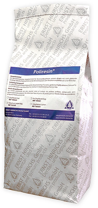 Speziell für die Bearbeitung von Kunststoffprothesen entwickeltes, geruchsneutrales Poliermittel. Gleiche Verarbeitung wie mit Bimssteinpulver, jedoch wirkt POLIRESIN® extrem abrasiv glättend und hat eine um 30 % höhere Standzeit. Dank der einzigartigen, kristallinen Struktur wird die Kunststoffoberfläche schonend poliert und der Zeitaufwand bis zur anschließenden Hochglanzpolitur deutlich reduziert. Zum Anrühren wird eine Bimsdesinfektion empfohlen.