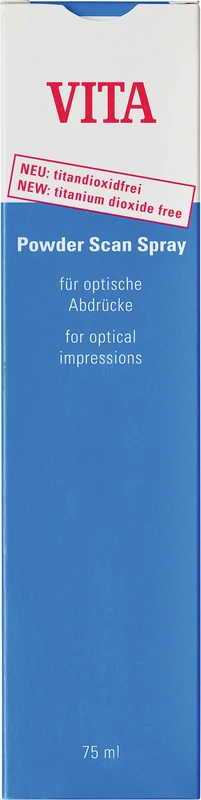 Der VITA Powder Scan Spray ist eine aufsprühbare, titandioxidfreie und blau eingefärbte Pigmentsuspension mit Minzaroma für die intraorale Applikation (Zahnoberfläche) sowie für die extraorale Anwendung (Gips Stumpf/ Gips Modell) zur Erstellung des opto-elektronischen Abdrucks bei CAD/CAM Restaurationen. Mit dem VITA Powder Scan Spray wird die Oberfläche des Zahnes bzw. des Modells mattiert, um eine optimale Aufnahme mit der Intraoralkamera (z. B. mit Sirona CEREC 3 oder CEREC AC) bzw. mit dem Scanner zu ermöglichen.