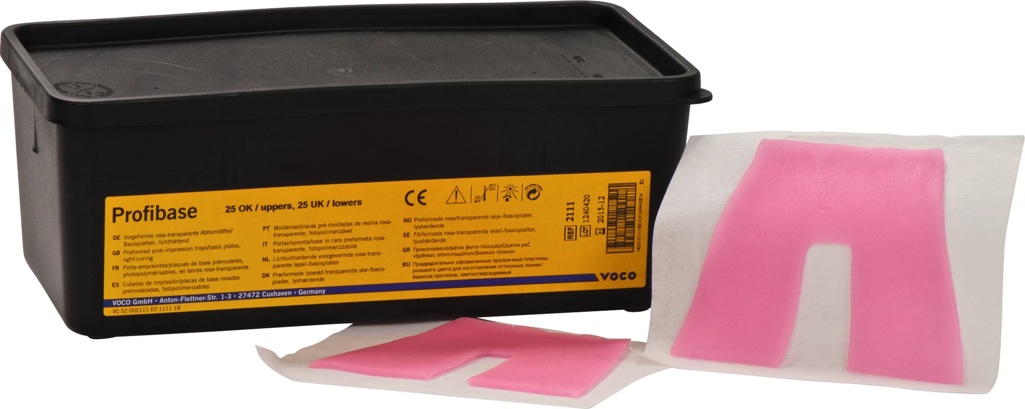 Profibase ist ein lichthärtendes rosa-transparentes Basisplattenmaterial zur einfachen und rationellen Erarbeitung von Wachsaufstellungen. Eine zahnfleischähnliche Farbgebung steigert die Akzeptanz bei Patient und Zahnarzt. Die Basisplatten lassen sich einfach und zeitsparend mit der Hand formen. Überschüssiges Material kann mit einem scharfen Messer abgeschnitten und - ein großer ökonomischer Vorteil von Profibase - wiederverwendet werden. Die Aushärtung erfolgt in einem handelsüblichen Halogenlichtgerät oder unter UVA-Licht.