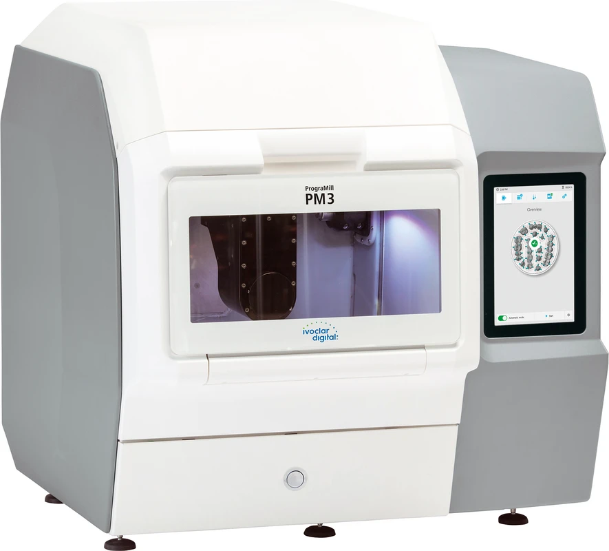 Die beiden Maschinen PrograMill PM3 und PM5 liefern die ideale Performance für das digitale zahntechnische Labor. Diese Modelle sind für die Nass- und Trockenbearbeitung und bieten eine hohe Material- und Indikationsvielfalt. Die präzise 5-Achs-Fertigung wird über den integrierten PC mit Touch-Monitor gesteuert. Die vollautomatische Materialverwaltung überprüft, ob die Werkzeuge mit der jeweils individuellen Bearbeitungsstrategie übereinstimmen. Der Werkzeugwechsler stellt in diesem Prozess die eigenständige und konstante Fertigung sicher.