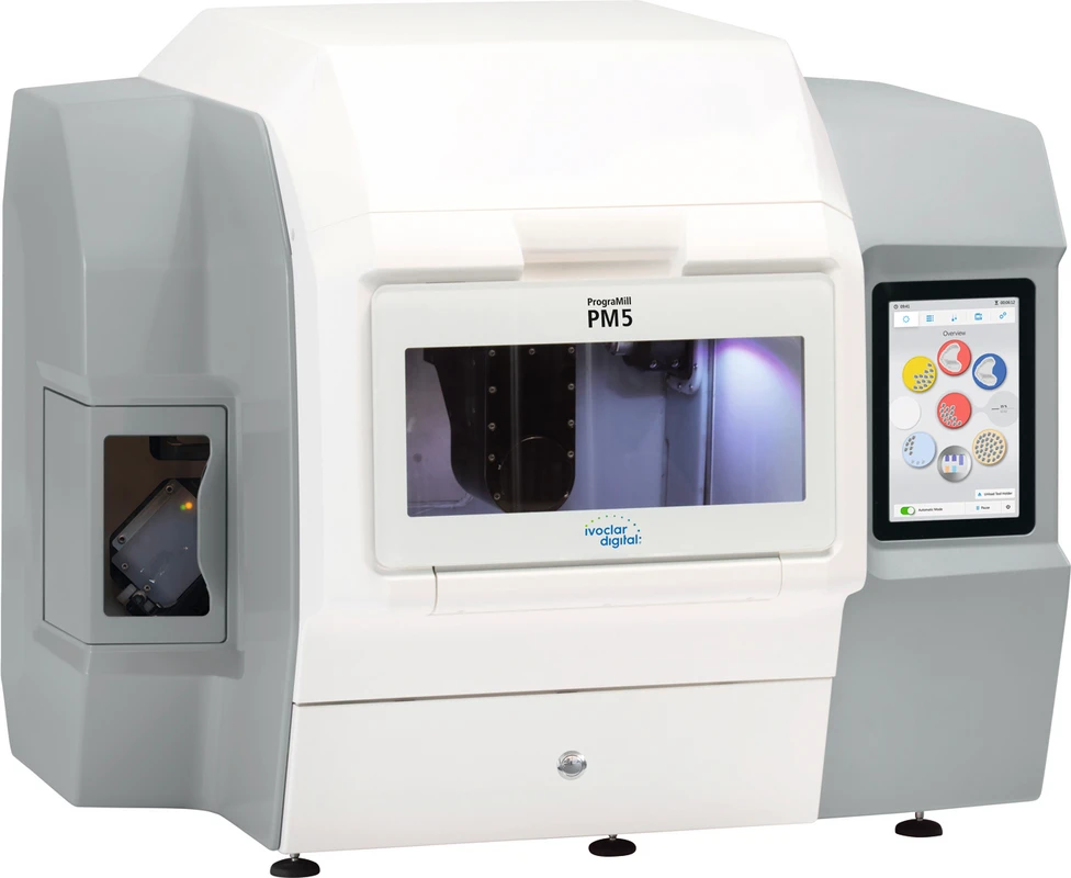 Die beiden Maschinen PrograMill PM3 und PM5 liefern die ideale Performance für das digitale zahntechnische Labor. Diese Modelle sind für die Nass- und Trockenbearbeitung und bieten eine hohe Material- und Indikationsvielfalt. Die präzise 5-Achs-Fertigung wird über den integrierten PC mit Touch-Monitor gesteuert. Die vollautomatische Materialverwaltung überprüft, ob die Werkzeuge mit der jeweils individuellen Bearbeitungsstrategie übereinstimmen. Der Werkzeugwechsler stellt in diesem Prozess die eigenständige und konstante Fertigung sicher. PrograMill PM5 bietet mit dem integrierten 8-fachen Materialwechsler die perfekte Automatisierung für Ihr Labor. Über den Materialwechsler können mehrere Fertigungsaufträge mit verschiedenen Materialien und Indikationen abgearbeitet werden. Je nach Material und Indikation kommen individuelle Bearbeitungsstrategien zum Einsatz. Das ermöglicht kurze Prozesszeiten für die jeweiligen Restaurationen.